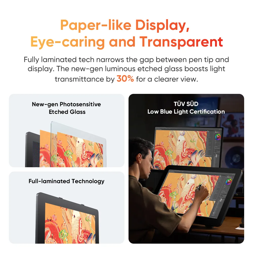 The fully laminated display eliminates the gap between the pen tip and the cursor, delivering a more natural writing experience. The new-gen luminous etched glass is only 0.7 mm thick, increasing light transmittance by 30%, retaining a paper-like feel while reducing fingerprints and improving clarity.